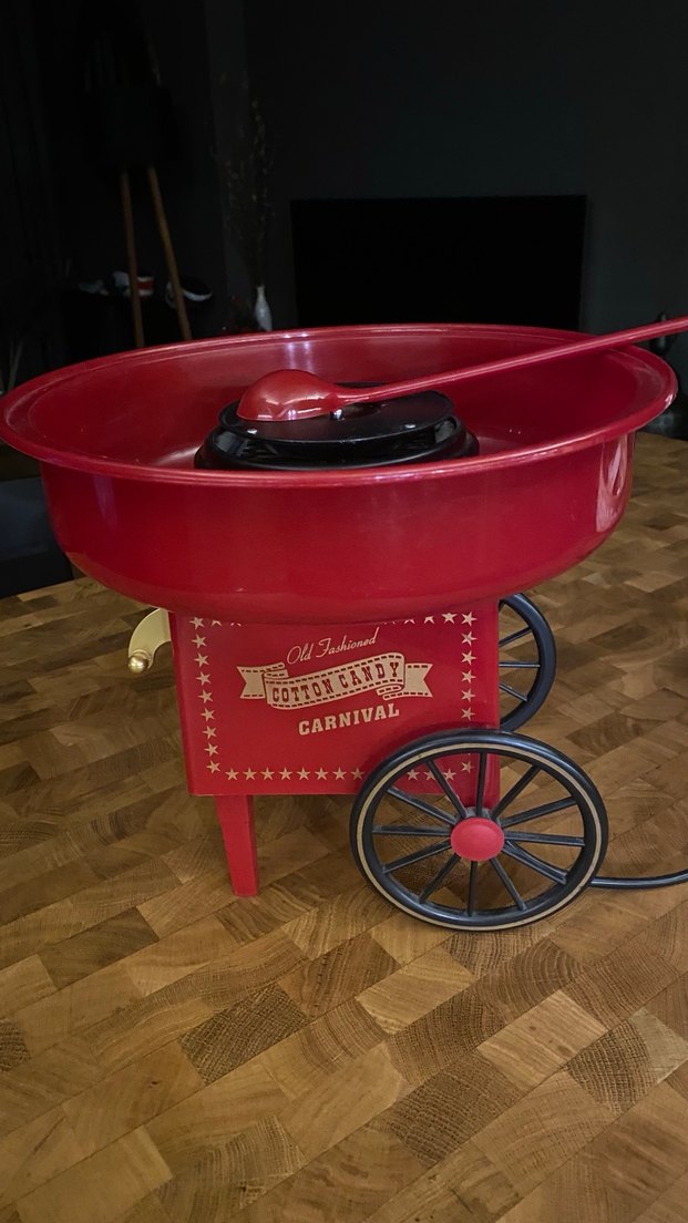 Kırmızı, vintage tarzda ve tekerlekli pamuk şeker makinesi. Önünde "CARNIVAL" yazısı bulunur. İtalyan Cucinox markadır az kullanılmış ve sorunsuz çalışır durumdadır. #pamukşekermakinası #mısırpatlatmamakinası #kırmızı #şeker #pamukşeker #oyuncak #çocuk #parti #doğumgünü