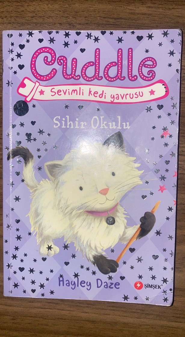 Pastel renkli kapakta sevimli beyaz kedi yavrusu olan 'Cuddle: Sevimli kedi yavrusu - Sihir Okulu' kitabı. Hayley Daze tarafından yazılmış, Şimşek yayınevi.