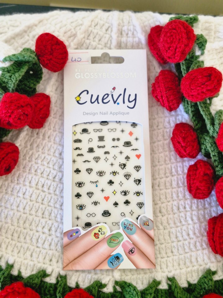 Cueily markasına ait çok renkli tırnak süslemeleri, göz, taç, elmas ve kalp gibi çeşitli küçük tasarımlar içerir.