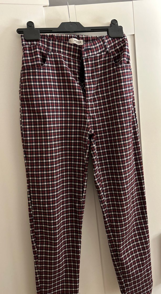 Bordo-lacivert-beyaz ekoseli, düğmeli, kumaş pantolon. Hiçbir kusuru yok. Kumaşı ince sayılır.