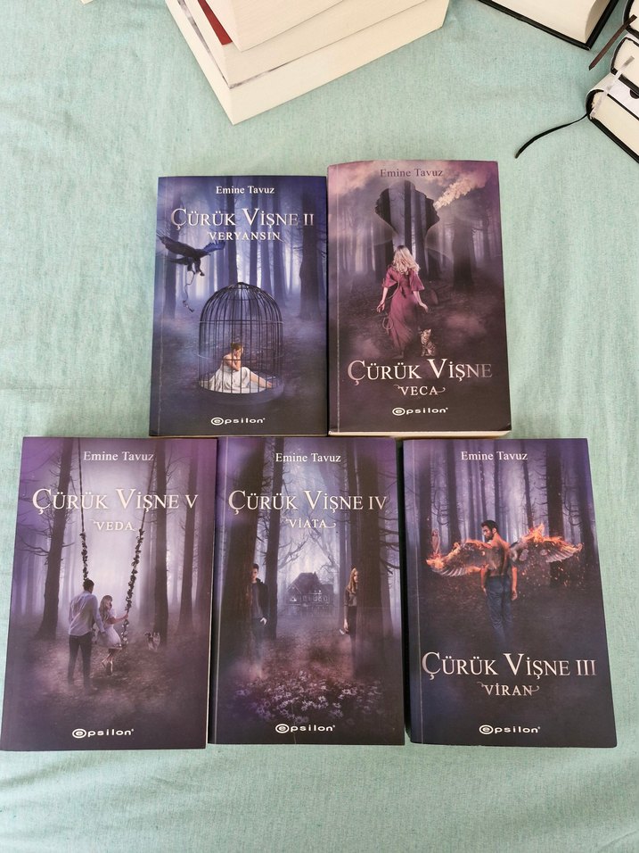 Emine Tavuz'un Çürük Vişne roman serisi, beş kitaptan oluşuyor. Karanlık ve gizemli temalarla orman ve sembolik görseller ön planda. Hiçbir hasarı yok karton kapak içlerinde poster ayraç mevcut.