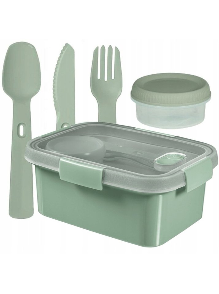 Yeşil yemek kabı, kapaklı ve kaşık, bıçak, çatal seti ile birlikte. Küçük yuvarlak saklama kabı içerir.