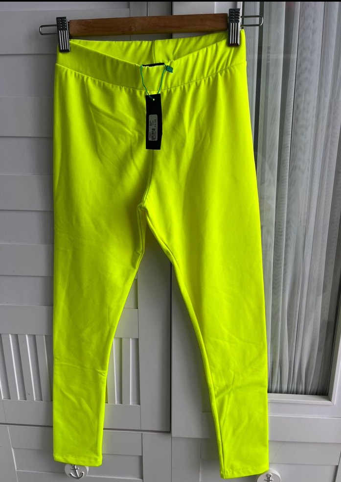 Sarı renkli, esnek bel bantlı, sentetik kumaştan yapılmış, midi boy, spor ve günlük kullanıma uygun dar kesim tayt.