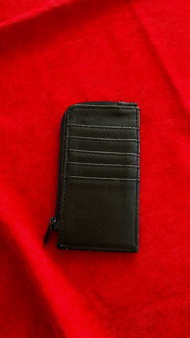 Siyah deri fermuarlı kadın cüzdanı, birden fazla kart yuvasına sahiptir. Minimalist ve desen içermeyen tasarımıyla günlük kullanıma uygundur.