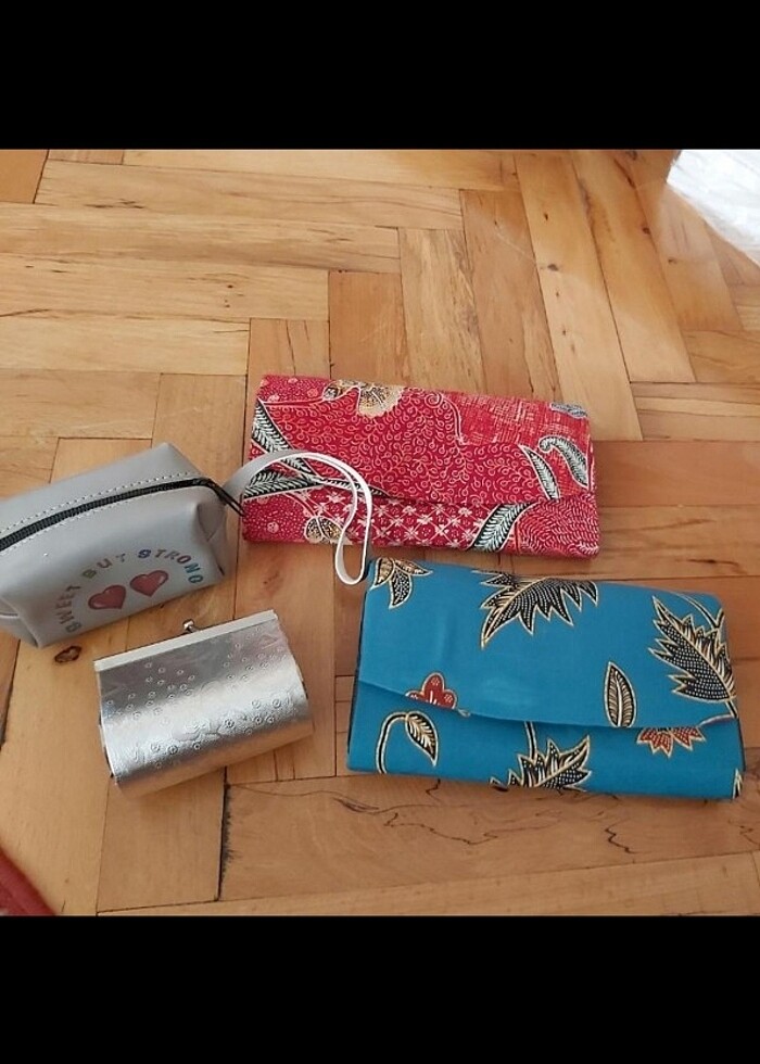 2 adet hiç kullanılmamış harika hediye olabilecek otantik desenli cüzdan( ebatları 19cm 11cm) ikisi 150 lira, yanında Hic kullanılmamış fermuarlı cüzdan ( ebatı 12cm 6cm) fiyatı 10 lira ve üzerine resimde de gösterdiğim gibi küçük bir yerine tükenmezle yazı yazılmış olan gri cüzdan fiyati 15 lira . Yani toplamda 4 cüzdan.