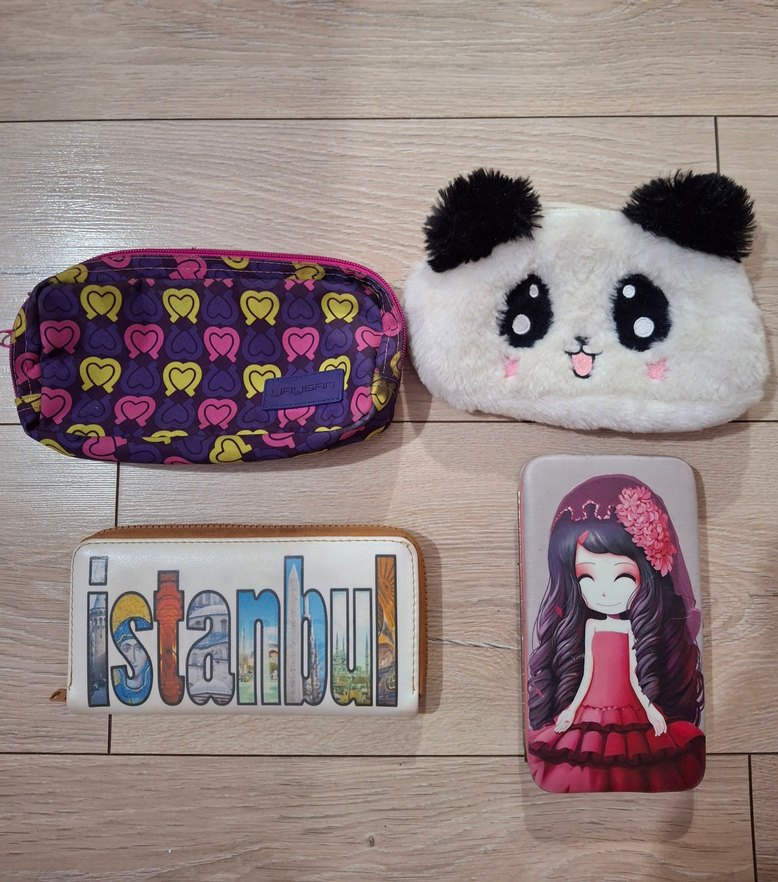 2 çüzdan 2 kalemlik hepsi kullanılabilir iyi durumda peluş olanın içine oje damladı ama dışında hiçbir sorun yok Alana hayırlı olsun.