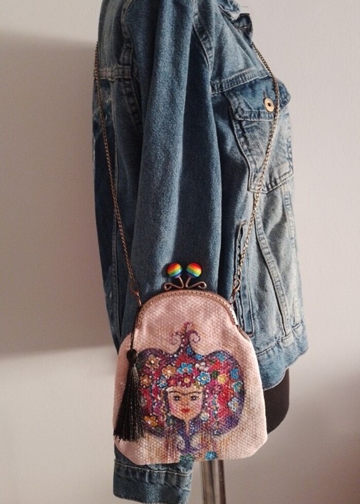 Özel Tasarim Firida Cüzdan Çanta İçi astarli, puskul detayli Elde Su bazli akrilik boya ile boyanmistir. Hic kullanilmadi