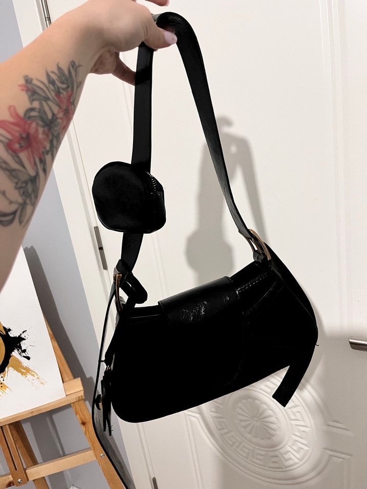Siyah deri çanta, yılan derisi desenli ve tokalı askıya sahip. Gotik ve Paris tarzını yansıtan günlük kullanım için uygun.