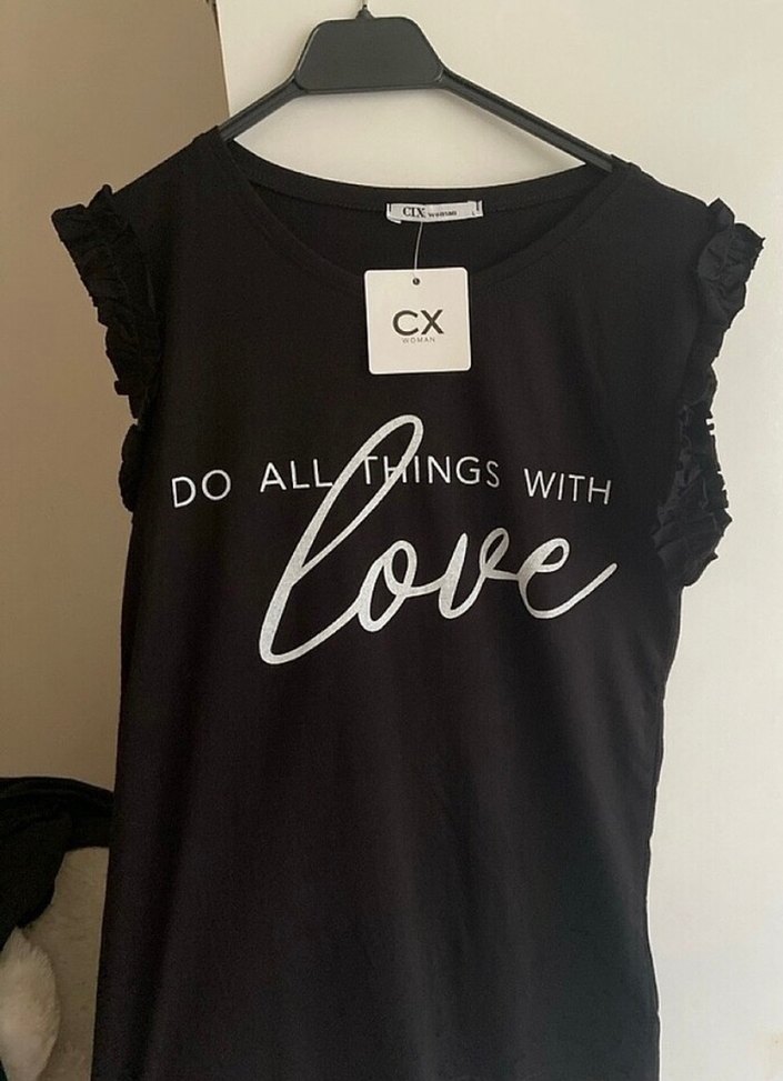 Siyah pamuklu tişört, , fırfırlı kısa kollu ve yuvarlak yakalıdır. Önünde "Do All Things With Love" yazılı baskı bulunur. Kalıbı dar