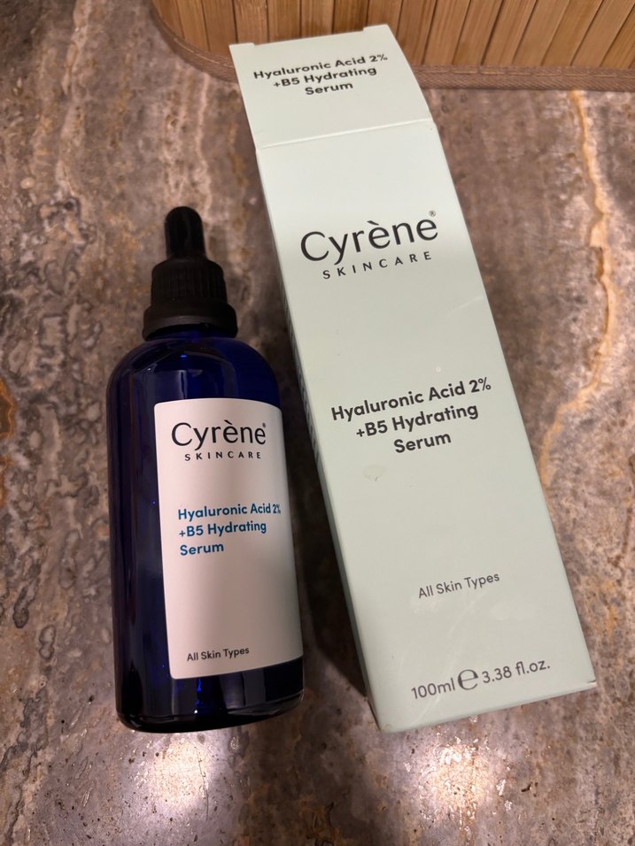 Cyrene Skincare'in 2% hyaluronik asit ve B5 vitamini içeren nemlendirici serumu, tüm cilt tipleri için uygundur, 100ml şişede. Açılmadı sktsi 2028