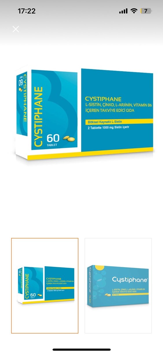 Cystiphane, L-sistin, çinko, L-arginin ve B6 vitamini içeren takviye edici gıdadır. 2 tablette 1000 mg sistin bulunur.