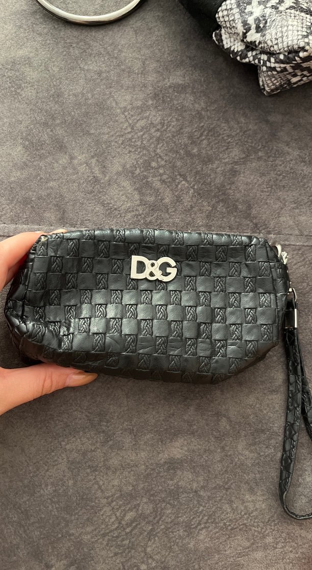 D&G logosu bulunan, yılan desenli koyu gri deri çanta, fermuarlı ve şık bir tarza uygun.