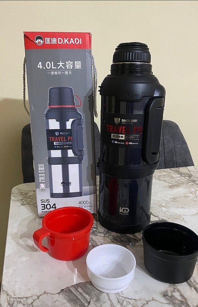 D.KADI siyah termos, 48 saat ısı koruması 4.0 litrelik kapasite ve paslanmaz çelik (SUS 304) malzemeye sahiptir. Taşıma kolaylığı sağlayan sap ve üç adet çıkarılabilir bardak içerir.