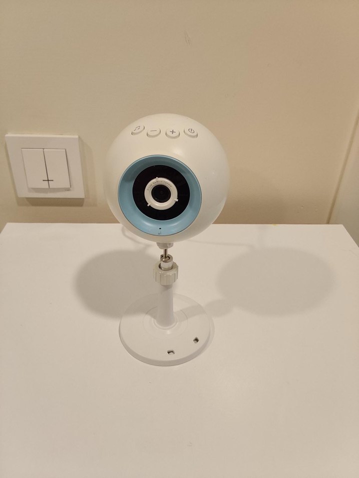Ayarlanabilir standlı, yuvarlak tasarımlı beyaz mini video kamera.