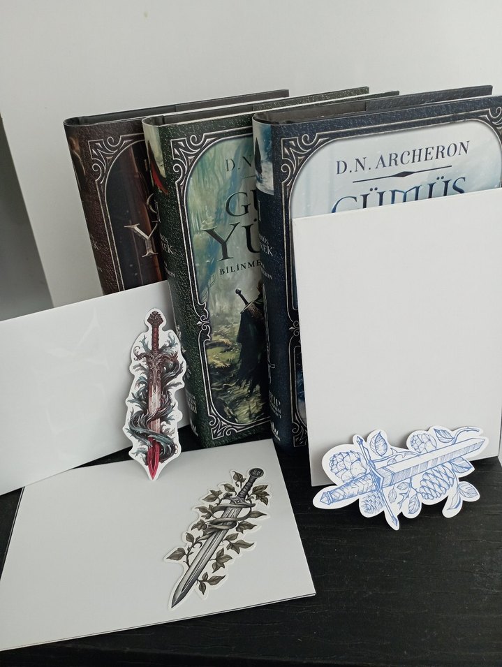 D.N. Archeron imzalı üç roman ve kılıç temalı dekoratif ayraçlar ile kartlar içeren set.