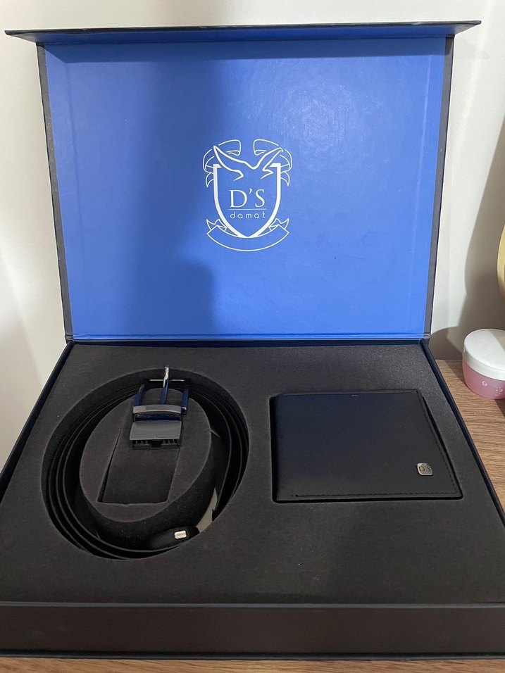 D'S Damat markalı, baskılı mavi cüzdan ve uyumlu kemer içeren, iş hayatına uygun klasik şıklıkta çağdaş tasarım set. Özel kutusunda.