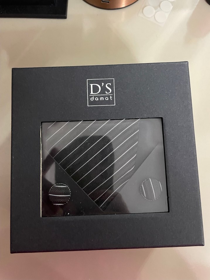 D'S Damat siyah çizgili erkek kravat ve uyumlu kol düğmeleri seti, şık bir kutuda sunulmuştur. İş ortamları için uygundur.