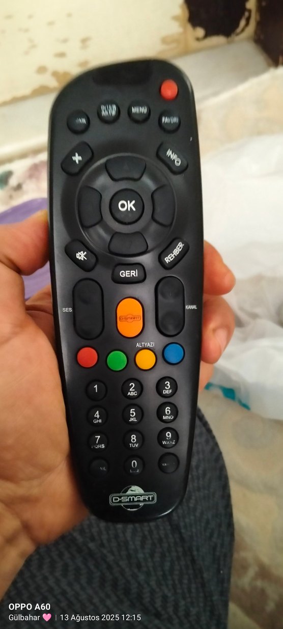D-Smart uydu alıcısı için navigasyon tuşları, renkli fonksiyon tuşları ve rakam tuş takımı bulunan kumanda. ALTYAZI, OK ve GERI tuşları mevcuttur.
