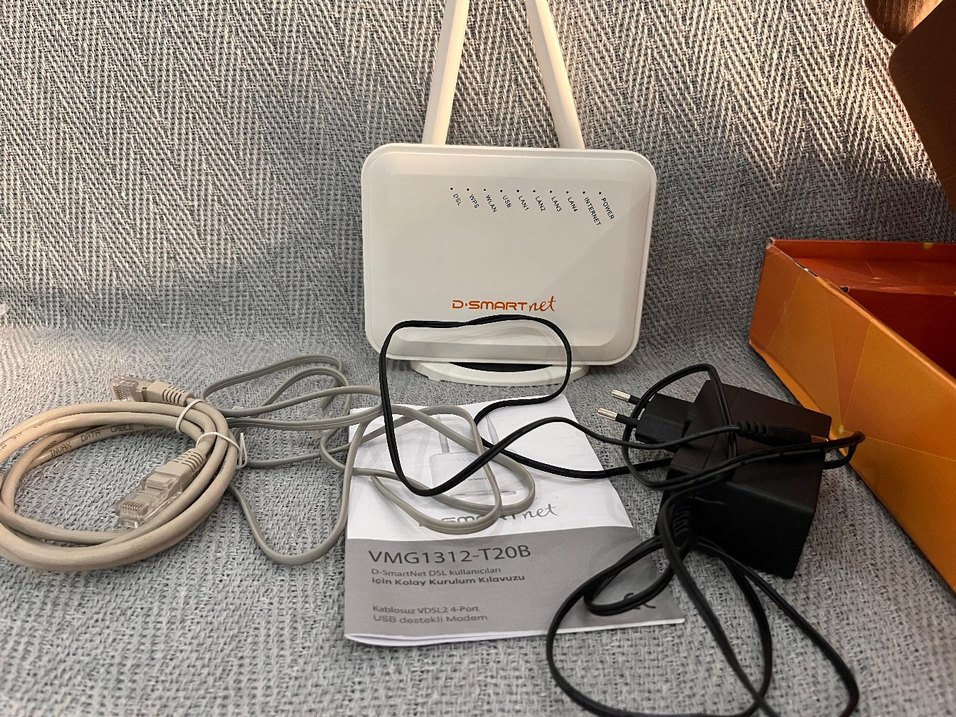 D-Smartnet VMG1312-T20B beyaz modem, çoklu gösterge ışıkları ve çift antenli. Güç ve USB kabloları ile birlikte gelir.