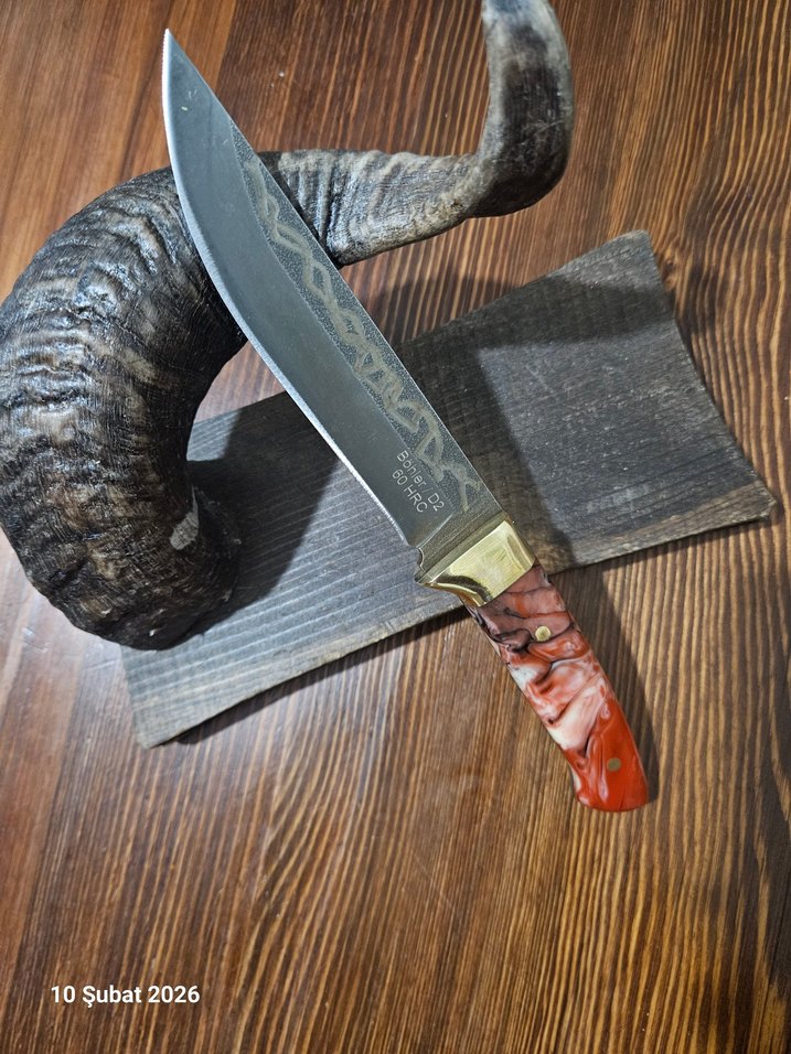 Böhler D2 çelik (tank paleti çeliği), pirinç balçak, epoksi kabzeye sahip özel el yapımı koleksiyonluk bir avcı kampçı bıçağıdır. Namlusu asit karartmalı ve el gravürü baskılıdır. Özel yapım vaketa deri kılıfıyla birlikte gönderilecektir.
