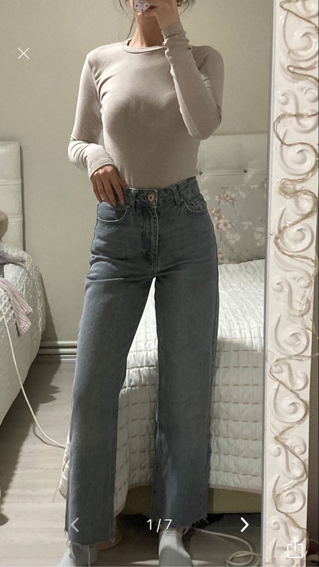 Gri renkli, midi boy, bol kesim kot pantolon, günlük kullanıma uygun rahat ve şık bir görünüm sunar. Koton ürünüdür. Boyunu ben d96 boyutunda kesmiştim