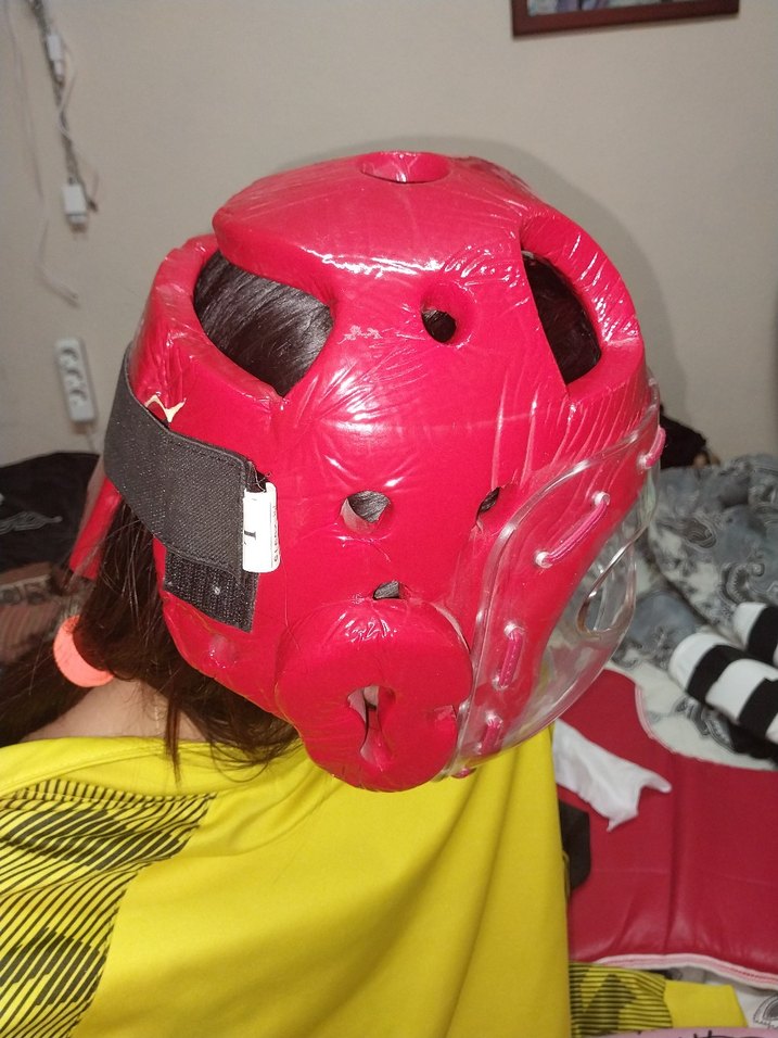 Kırmızı plastik sporcu kaskı, renkli baskılı tasarıma ve tokalı güvenli yapıya sahiptir. Rock punk havası ve avangart stili taşır. Üzerinde 'Daedo' markası bulunur. ️Arka kısımda az bir deforme var ancak kullanıma engel değildir