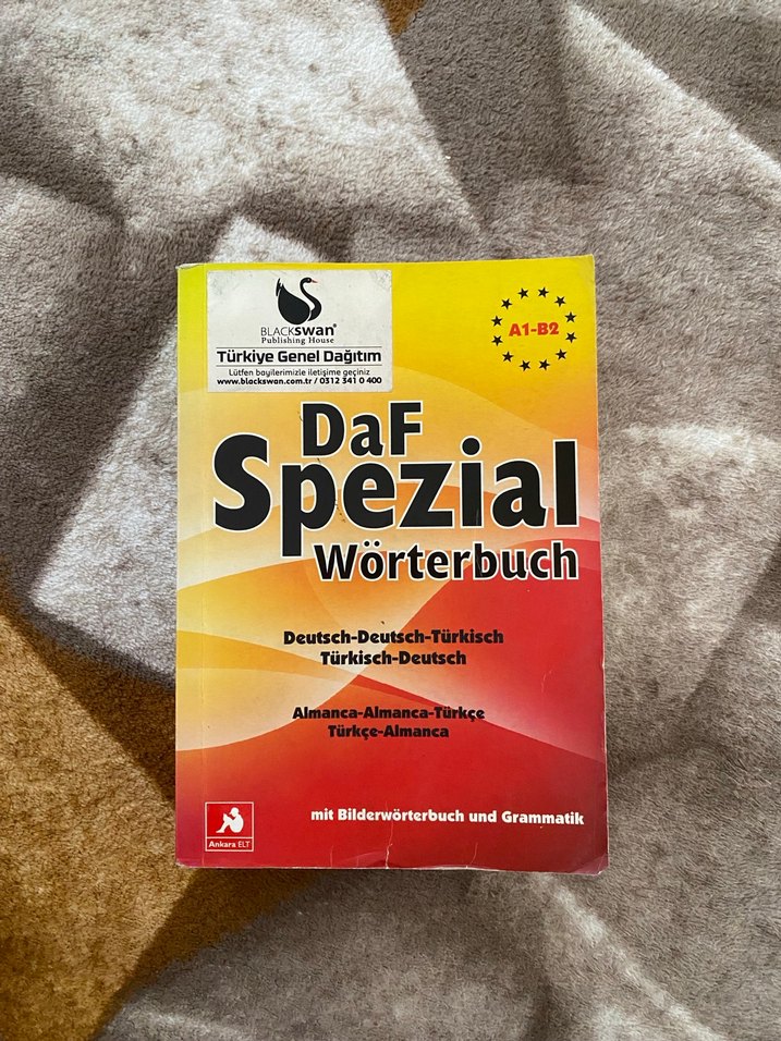 DaF Spezial sözlük, Almanca-Almanca-Türkçe ve Türkçe-Almanca çeviriler sunar, resimli sözlük ve gramer içerir. A1-B2 seviyeleri için uygundur. İçerisinde resimli bölgeden 1 sayfa kopmuş ama kaybolmadi arasinda duruyor fotoğrafta belirttim