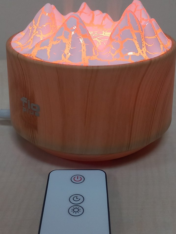 renkli dağ tasarımlı, bej tonlarında ahşap görünümlü hava temizleyici ve nemlendirici, uzaktan kumandalı.