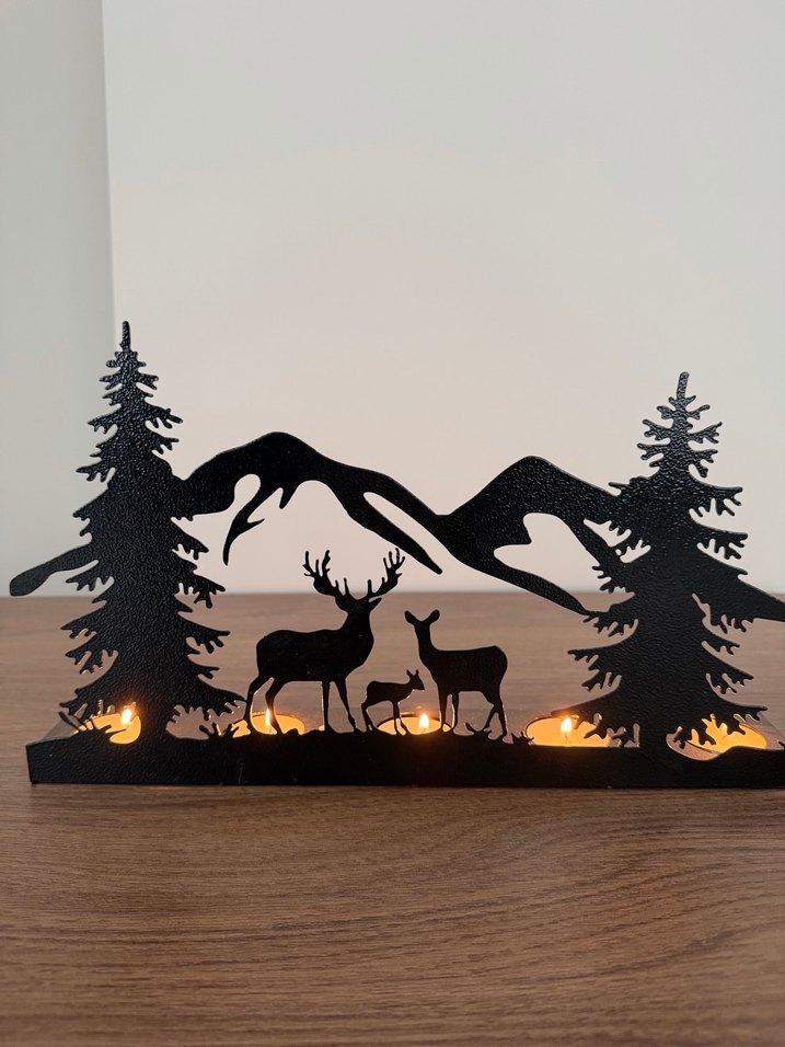 Siyah renginde, dağ ve geyik figürlü metal mumluk, yanan mumlarla sıcak ve doğadan ilham alan bir atmosfer yaratır. #mumluk #gayik