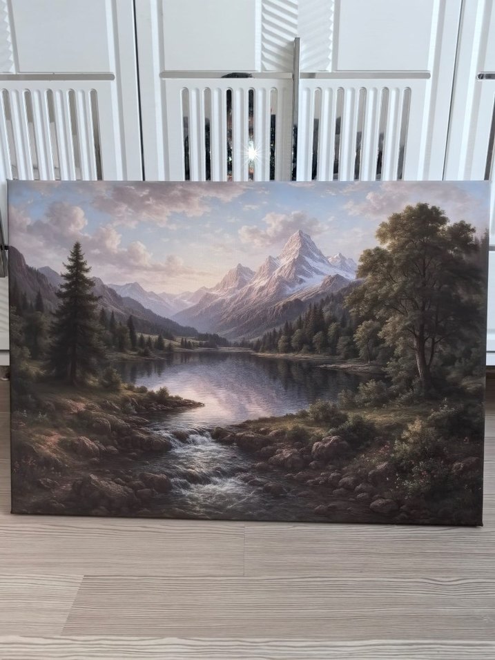 Bu yağlı boya tablo, ağaçlar ve kayalık araziyle çevrili göletin yansıttığı sakin dağ manzarasını bulutlu gökyüzü altında gösteriyor. Kanvas tablo dijital baskı 50x70 cm güncel