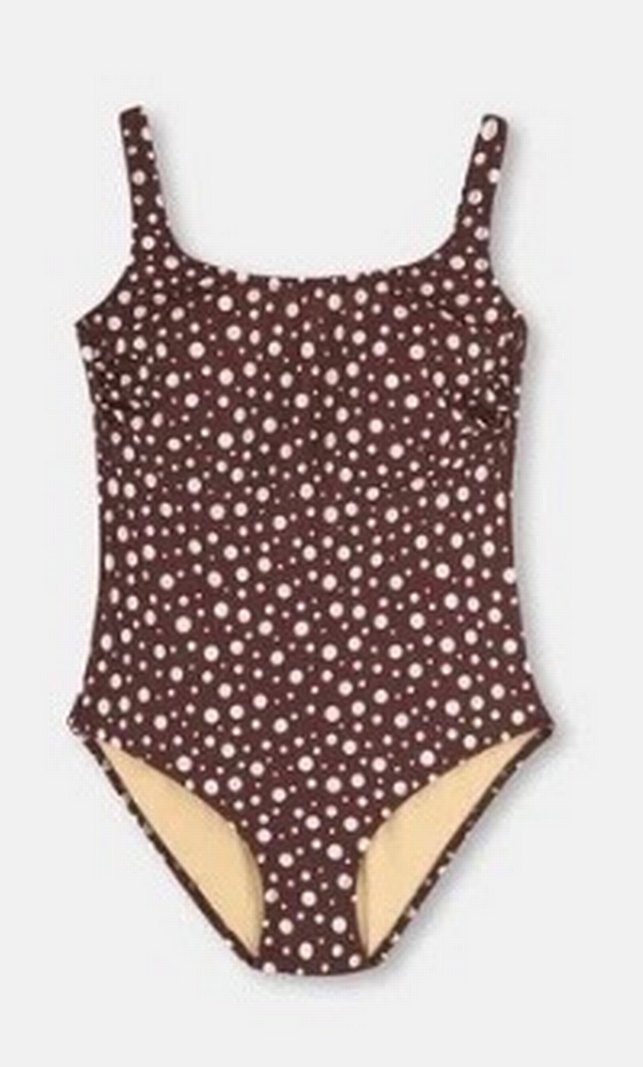 Kahverengi, puantiyeli ve ince askılı bu mayo, vintage ve çağdaş tarzı bir araya getirerek plaj için uygun bir görünüm sunar.