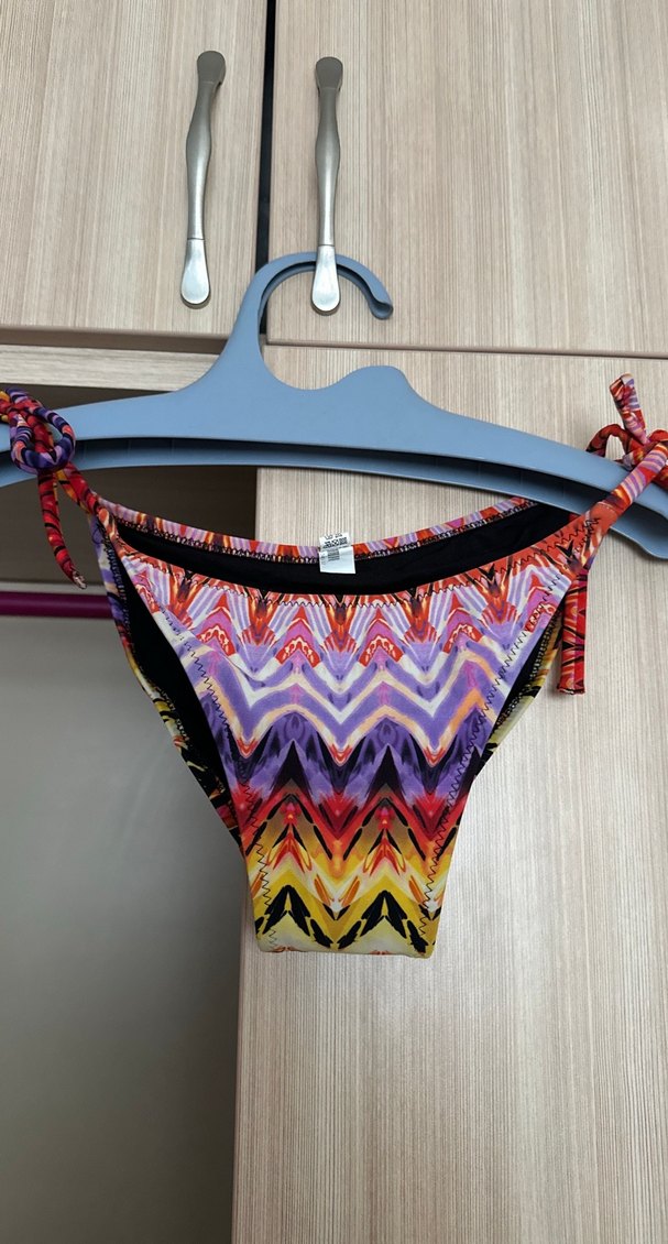 Renkli tie-dye desenli, bağcıklı yan detaylı, elastik yapıda bohem tarzı bikini altıdır. Plaj için uygundur.