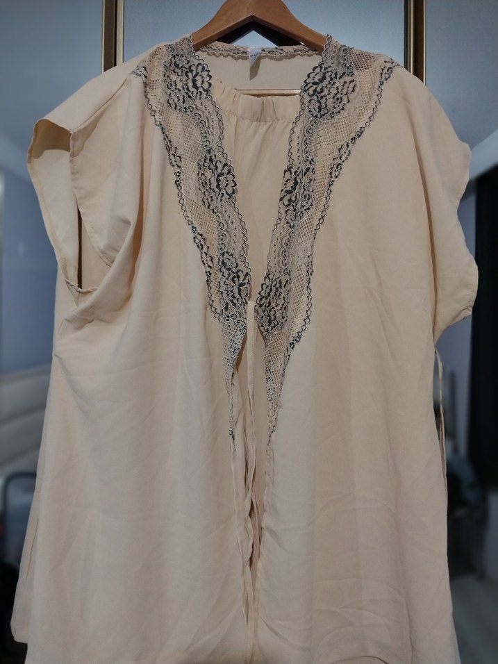 Bej renkli, V yaka ve dantel detaylı, salaş kesim, kısa kollu gecelik takım Günlük kullanıma uygun.
