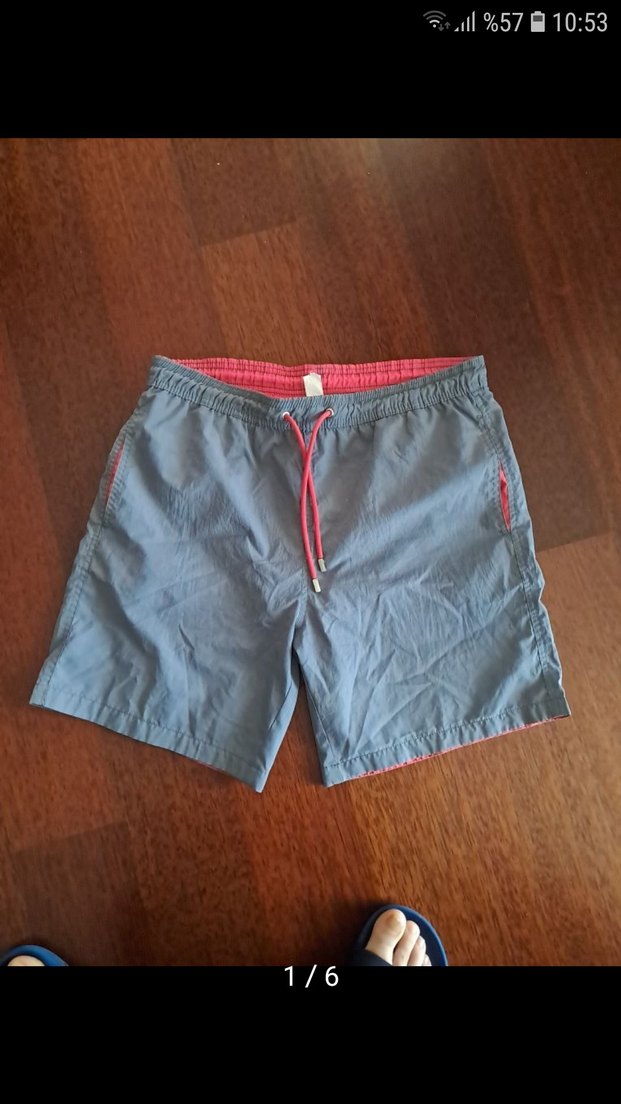 Gri renkte, bel detaylı ve kırmızı bağcıklı, bol kesim erkek deniz şortu. Beden degisikliginden satışta.
