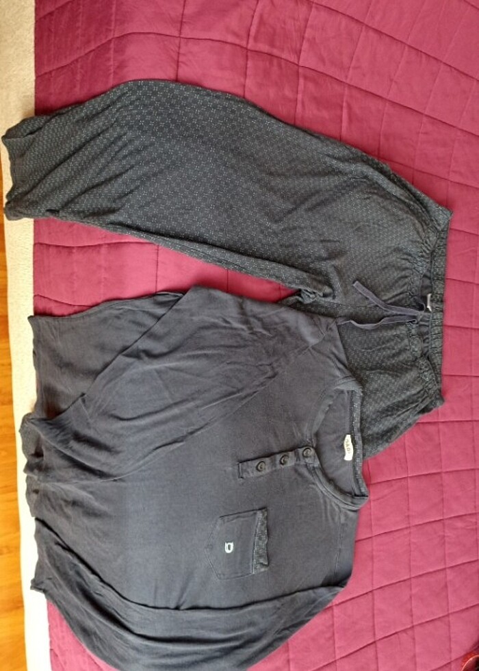 DAGİ marka erkek pijama takımın üst parçası laciverttir.Kol ve yaka etrafında pijama altıyla aynı desende biye vardır.Pujama altı lacivert üzerine küçük yeşil renkli desenlidir.Large bedendir.Kullanıma bağlı aşınması ve renk atması vardır.Omuz genişliği 100 cm, göğüs genişliği 108 cm, pijama üsrü uzunluğu 66cm,bel çevresi 80cm,kalça çevresi 114cm, paça boyu 101cm