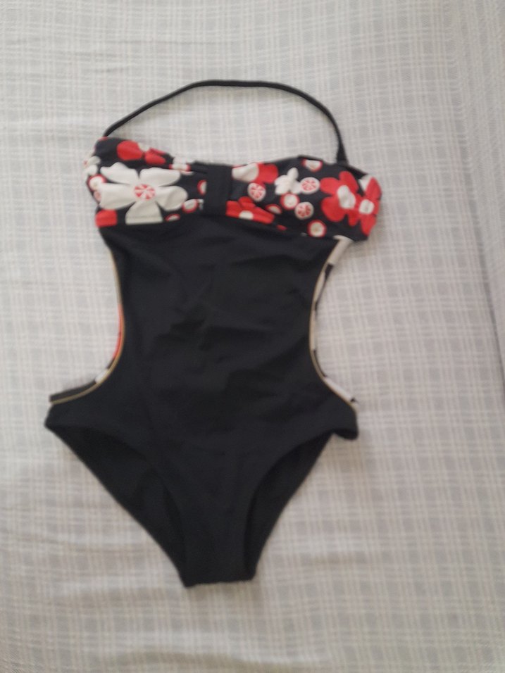 Tokalı çiçek desenli, askılı ve vücuda oturan kadın mayo. Koyu renkli, midi boy ve plaj için uygun avant-garde tarzda. Lastikleri sapasağlam yeni tertemiz