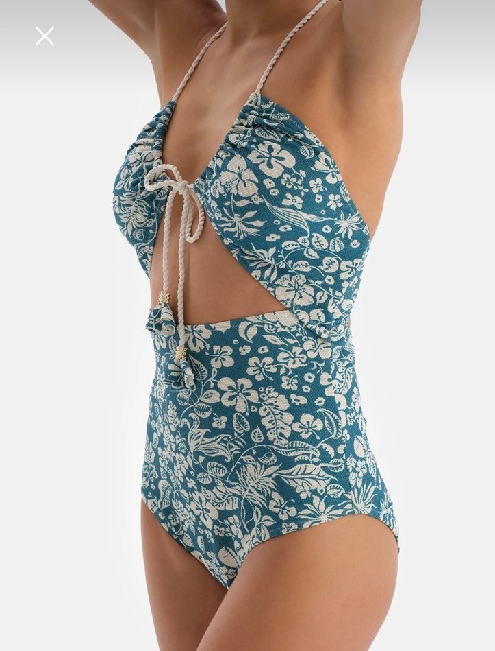 Bohem tarzda, dantel detaylı, askılı ve baskılı çiçek desenli turkuaz renkli, kısa boy mini mayo. Plaj için uygun.