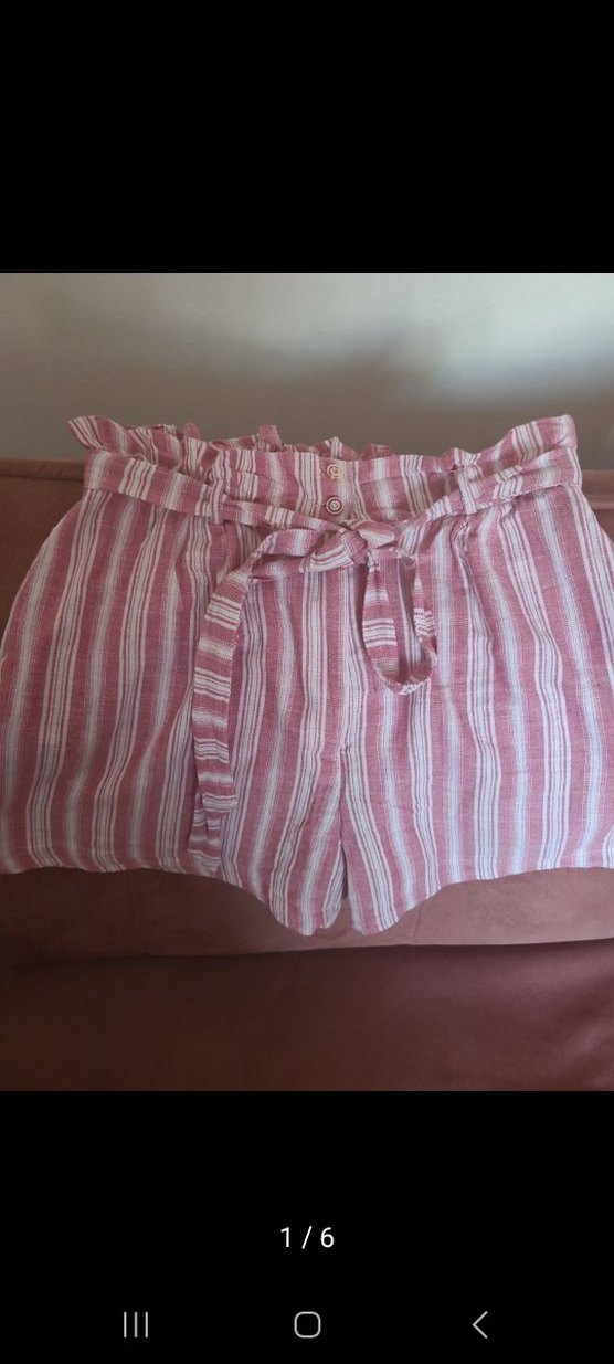 Yumuşak keten kumaştan, çizgili desenli, fırfırlı detaylı ve bağcıklı pembe mini şort. Rahat ve salaş kesim, günlük kullanıma uygun.