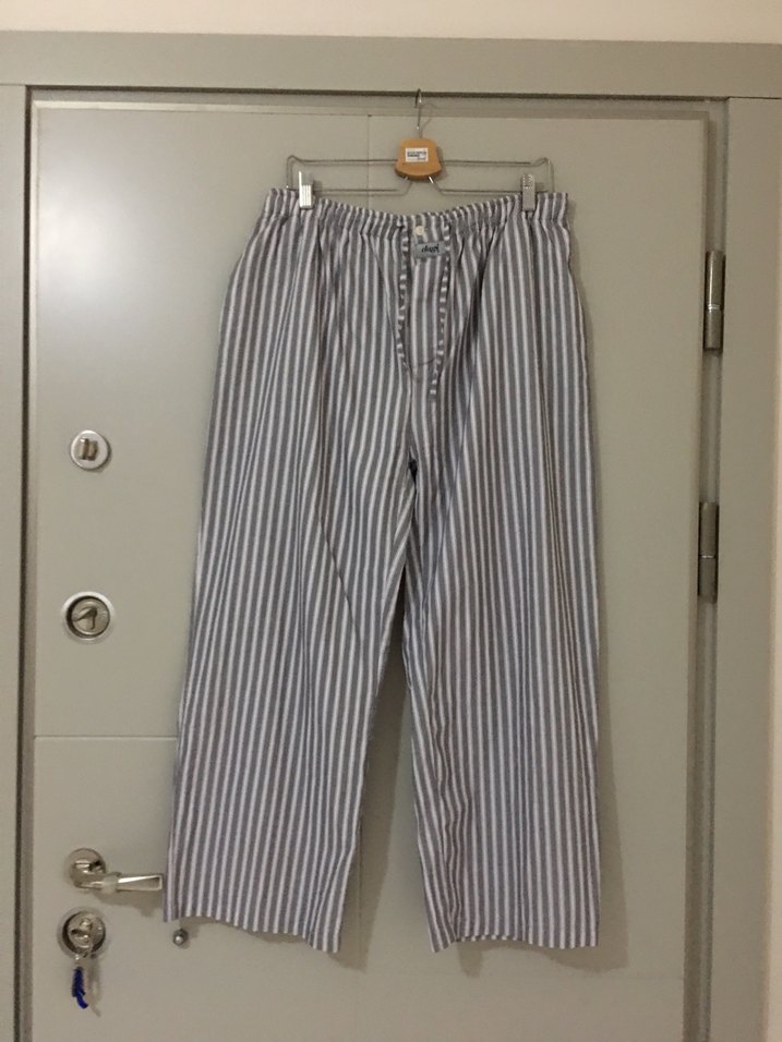 Gri çizgili pamuklu, bol kesim ve pileli detaylı midi boy kadın pantolon, günlük rahat kullanım için uygundur.