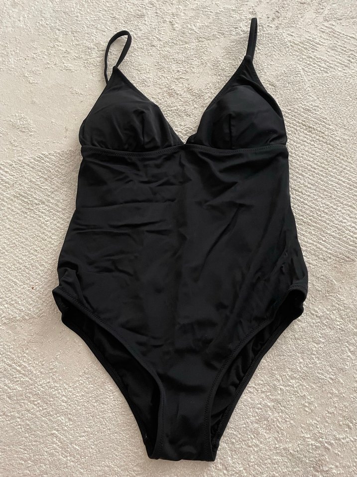 Siyah, ince askılı, vücuda oturan kadın mayo, desen içermeyen minimalist ve cesur bir tarz sunar. Sadece 1 kez giyildi, küçük geldi o yüzden satıyorum