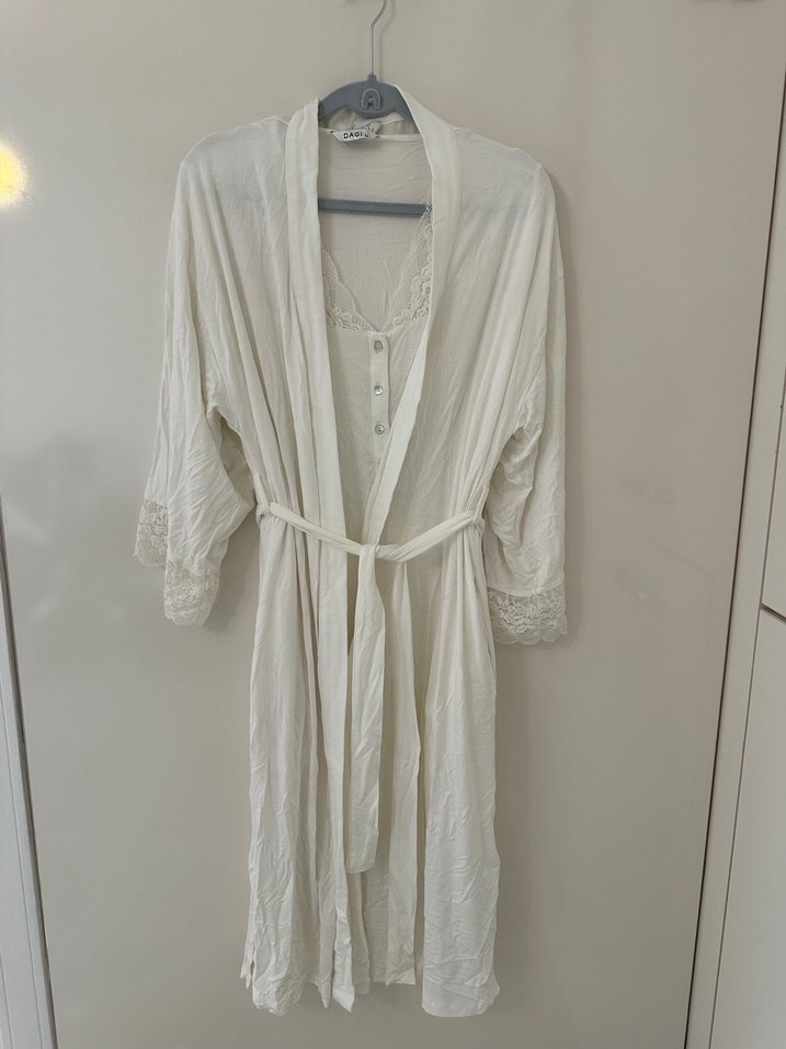 Bol kesim, uzun beyaz gecelik sabahlık takım, askılı kol ve dantel detaylı, rahat bohem tarzda. Bel bağlama özelliği ve yumuşak kumaşa sahip. Kumaşı çok kaliteli ve yumuşacık. Sadece 1 kere doğum sonrası fotoğraf çekilmek için giyildi. Dagi markası