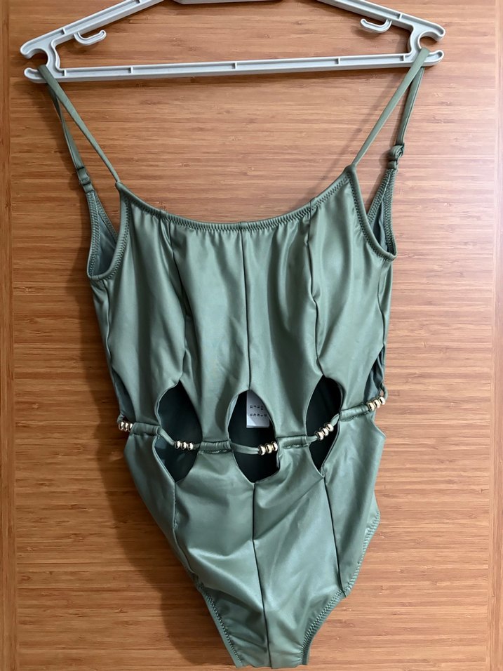 Fitted kesim, ince askılı yeşil mayo, belinde zincir detaylarıyla avant-garde sokak tarzını yansıtıyor. Hiç kullanılmadı.Etiketi mevcut . Etiketi 38 beden ama kalıbı dar . 34-36 beden için uygundur.