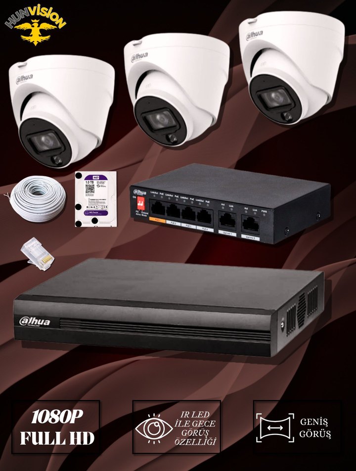 PAKETİN İÇİNDEKİLER; -3 Adet Dahua IP 2 mp Gece Görüşlü Kamera -1 Adet Dahua 2 mp 4 Kanal NVR Kayıt Cihazı -1 Adet 1 TB Harddisk -1 Adet 4 lü PoE Switc -6 Adet Eternet Rj45 Jack -100 Metre Bakır Cat6 Kablo - Yüksek çözünürlüklü görüntü kalitesi: 2 MP çözünürlük ile net ve detaylı görüntüler elde edersiniz. - Güvenilir : DAHUA marka kamera sistemi, dayanıklılığı ve uzun ömürlü kullanımı ile tanınır. - Kolay kurulum: Full paket içeriği sayesinde kurulum işlemi hızlı ve pratiktir. - İki kamera ile kapsamlı izleme: İki adet kamera ile geniş bir alanı izleyebilir ve güvenlik ihtiyaçlarınıza daha etkili bir şekilde cevap verebilirsiniz. Tüm Dahua Ürünlerimizin 2 Yıl Garantisi Vardır Montajını Yaptığımız Sistemlerde 1 Yıl Servis Garantisi Firmamınz Tarafından Verilmektedir. İstanbul İçi Ücretsiz Keşif İçin Bizimle İletişime Geçebilirsiniz.