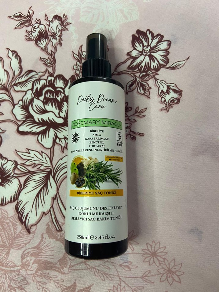 Daily Dream Care Biberiye Saç Toniği, saç derisi dolaşımını destekler, dökülmeye karşı korur ve besler. 250 ml sprey şişede, biberiye ve doğal özler içerir hiç kullanılmadı
