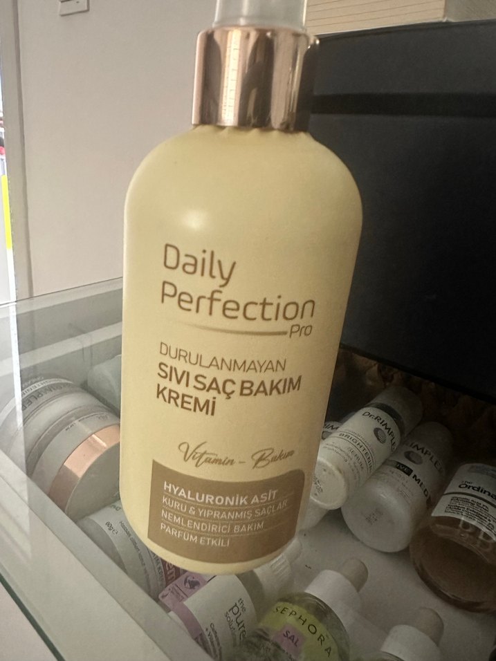 Daily Perfection Pro durulanmayan sıvı saç bakım kremi, hyaluronik asit ve vitamin içerir. Kuruluk ve yıpranmayı önler, nemlendirici bakım sağlar. ♀️ sadece 1kez sıkıldı