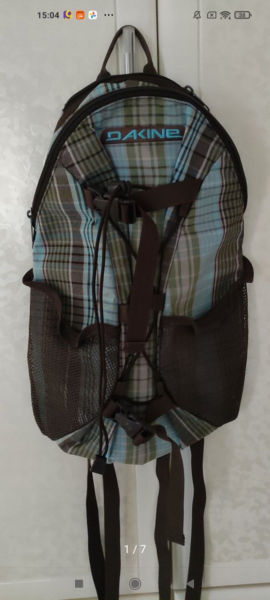 Dakine markalı, kahverengi ve gri tonlarda ekose desenli, sentetik kumaştan yapılmış sırt çantası. Tokalı kapanışı ve file yan cepleriyle dış mekan kullanımı için uygundur. kilit yerlerindeki kusur dışında tertemiz