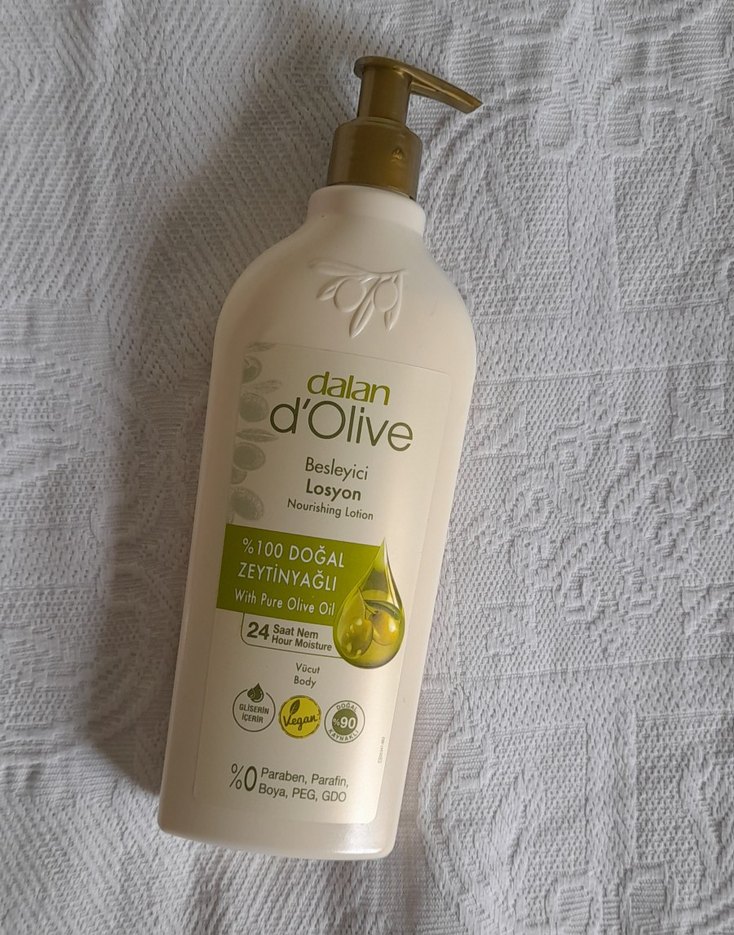 Dalan d'Olive besleyici losyon, saf zeytinyağı ile 24 saat nem sağlar. %100 doğal, vegan ve paraben, parafin, boya içermez. Sıfır Ürün