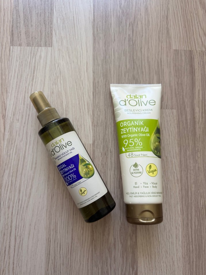 Dalan d'Olive Organik Zeytinyağı bakım seti; %95 organik zeytinyağı içeren besleyici krem ve %100 doğal zeytinyağı spreyi içerir. Saç ve cilt için uygundur.
