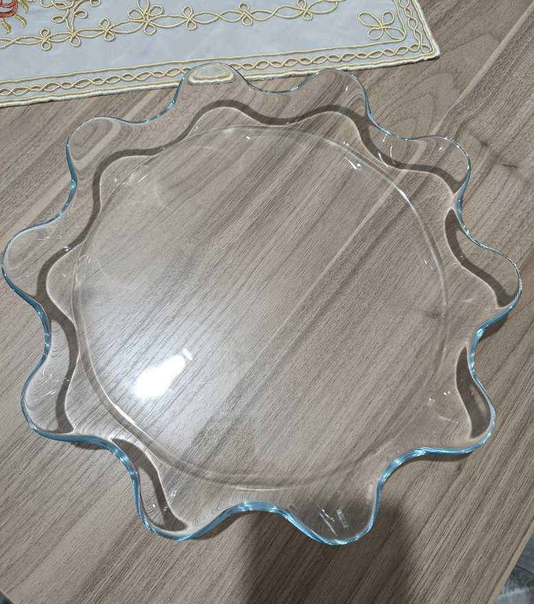 Dalgalı kenarlarıyla şeffaf cam servis tabağı, çağdaş tarzda tasarlanmıştır. Şık sunumlar için uygundur. ️