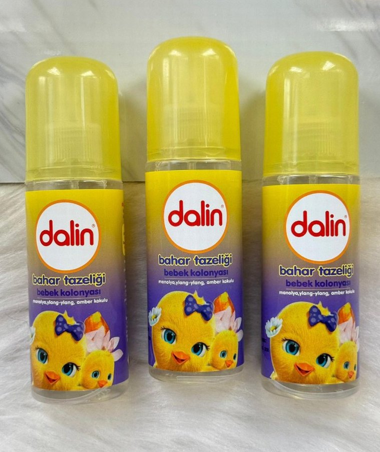 Dalin bahar tazeliği bebek kolonyası, ylang-ylang ve amber kokulu, renkli sarı şişelerde. Bebekler için hafif koku.